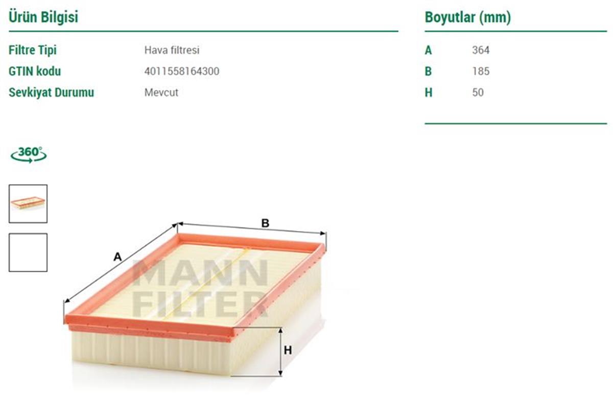 MANN HAVA FILTRESI VW GOLF 98-06 AUDI A3 97-03 SEAT LEON 00-06 SKODA OCTAVIA 97-11 otogelyedekparca.com'da OEM KODLARI :